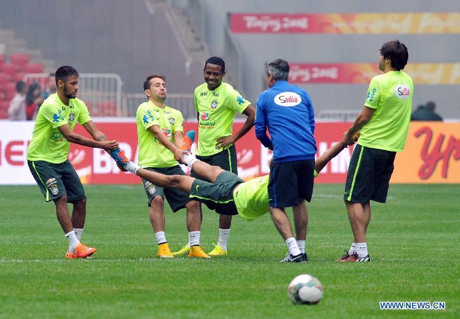 Brazil's Naymar (1st L) and Kaka (1st R) attend a training session with their teammates one day before a friendly football match between the Brazilian and Argentinian national teams in Beijing, capital of China, Oct 10, 2014. (Xinhua/Gong Lei)