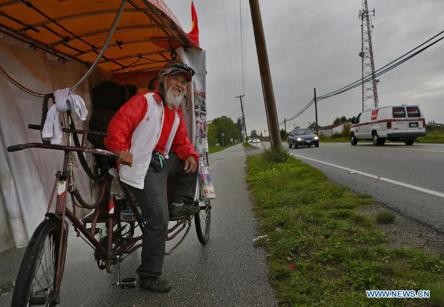 Olympic rickshaw rider Chen Guanming is seen with his tricycle in Vancouver, Canada, Oct. 10, 2014. Chinese 58-year-old farmer Chen Guanming pedalled his rickshaw to 18 countries in the past 13 years. He will take his route from Canada to Brazil to mark his 3rd attendance of the Olympic Games venue in Rio de Janeiro in 2016 after the London and Beijing Olympic Games. His journey is aimed at bringing Olympic spirit and national pride to people across the world and also raise the awareness of environment protection. (Xinhua/Liang Sen)