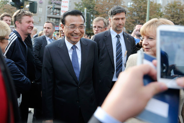 Premier Li Keqiang, accompanied by German Chancellor Angela Merkel, meets local residents on a Berlin street on Oct 10, 2014.(Source:english.gov.cn/chinadaily.com.cn/Photo:Xinhua)