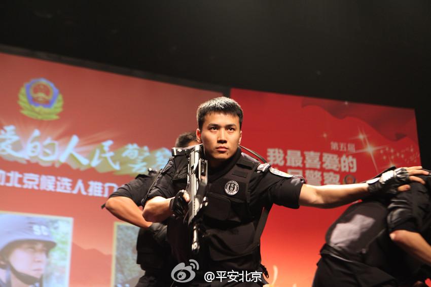 Cao Zhigang, a candidate for the fifth "My favorite people's police officer" came to Beijing Film Academy on Oct. 9, 2014. Cao and his colleagues told college students their own crime-fighting stories, and performed a cool posing gun show.