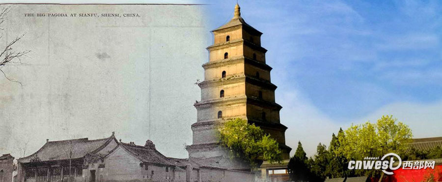 Giant Wild Goose Pagoda at present and in the past. The original pagoda was built during the reign of Emperor Gaozong of Tang in 652 to store images of Buddha and sutras taken back from ancient India by Xuanzang, a Chinese Buddhist monk. The pagoda is the largest brick tower dating back in Tang Dynasty. (Cnwest/Li Gaofeng)