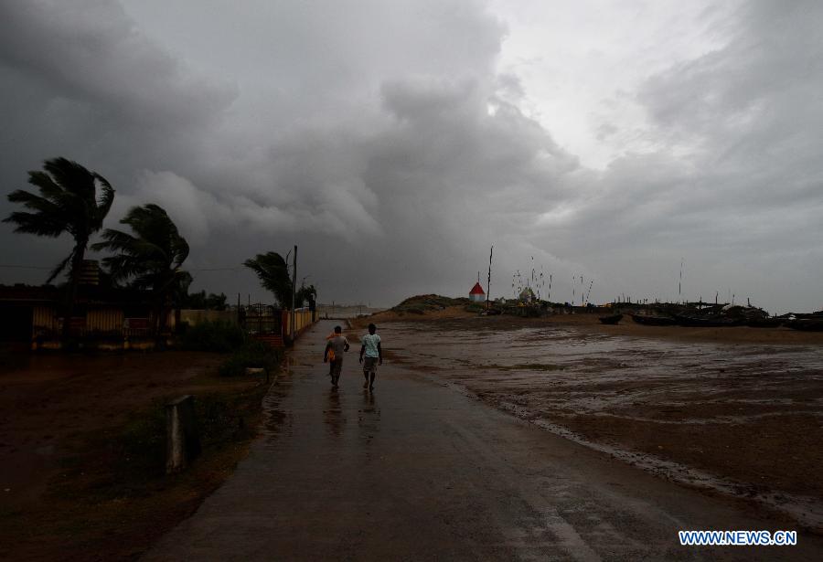 Two villagers walk through strong winds at the Bay of Bengal coast in Gopalpur, east India's state of Orissa, on Oct. 12, 2014. At least six people were killed Sunday when severe cyclone "Hudhud" hit the east coast of India with winds of almost 200 kmph, said officials. (Xinhua/Stringer)