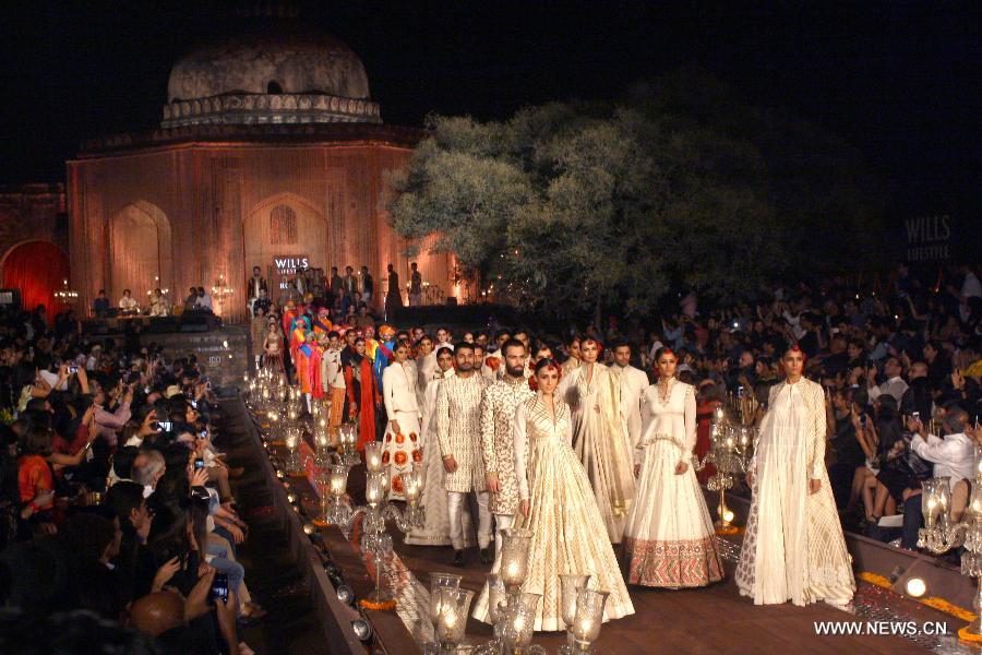 | Models display creations of Indian fashion designer Rohit Bal during the Grand Finale of "Wills Lifestyle India Fashion Week Spring-Summer 2015" in New Delhi, India, Oct. 12, 2014. (Xinhua/Partha Sarkar) |