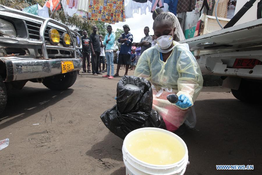 Health worker Garmai Sumo mixes chlorine with water to make disinfectant for sanitizing a residential area where a resident died of Ebola as other health workers retrieve the patient's body in Monrovia, capital of Liberia, on Oct. 14, 2014. (Xinhua/Marcus DiPaola)