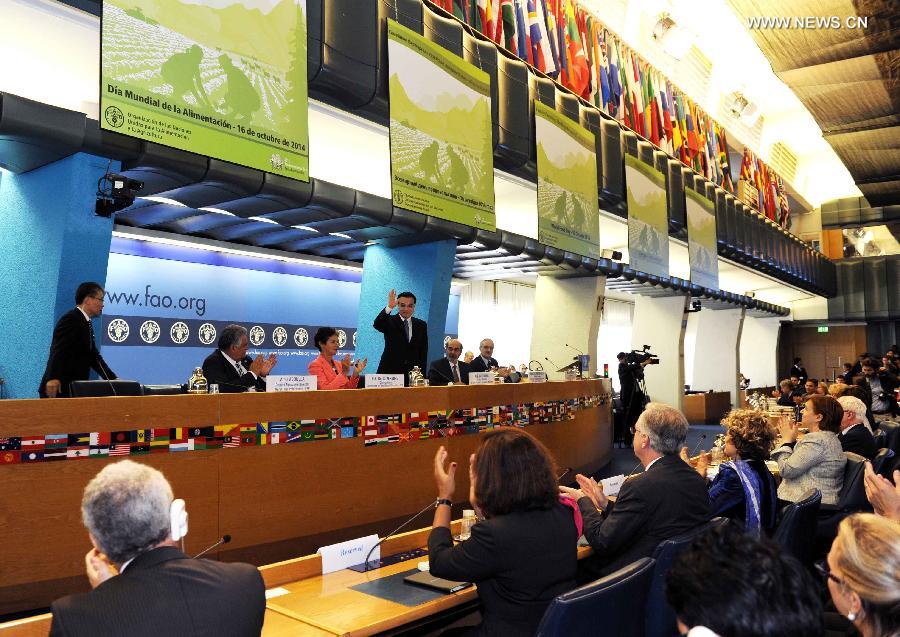 Chinese Premier Li Keqiang gives a speech at the headquarters of the UN Food and Agriculture Organization (FAO), in Rome, Italy, Oct. 15, 2014. (Xinhua/Rao Aimin)