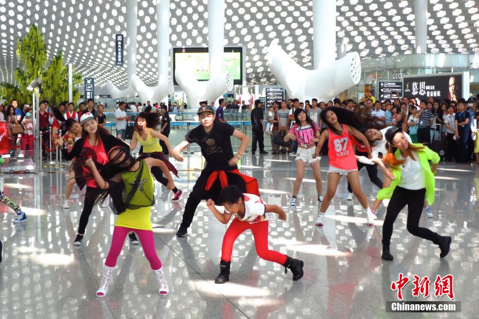 Dancers perform street dance in the departure lounge of Shenzhen Bao'an International Airport on Oct.12, 2014. The airport has witnessed 328 million trips and transported more than 9 million tons of goods in 23 years. (CNS/Chen Wen)