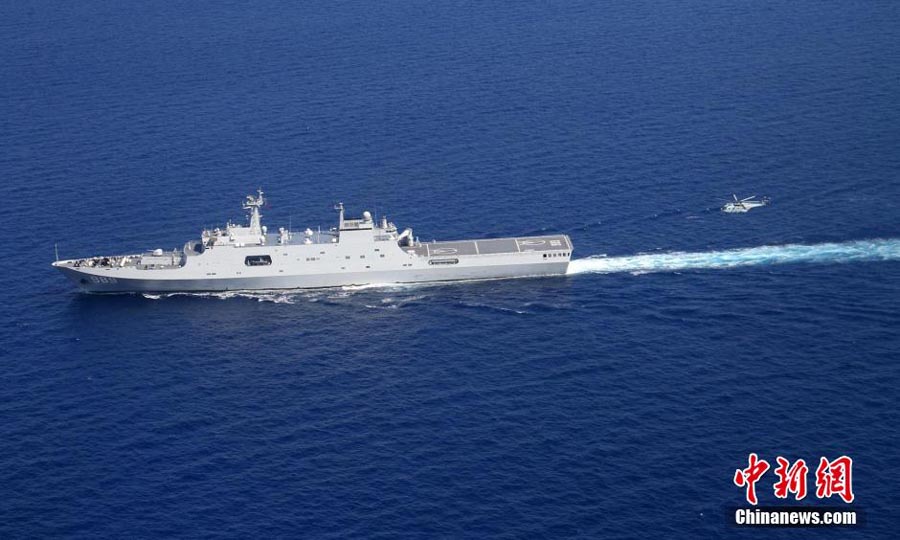 | The Chinese naval escort fleet executing escort mission in the Gulf of Aden carries out ship-based helicopter flight training on Oct. 13, 2014. In view of the characteristics of the recent pirate activities, the fleet aims to improve the ability to deal with emergency situation through the training. (Chinanews.com/Deng Minghua) |