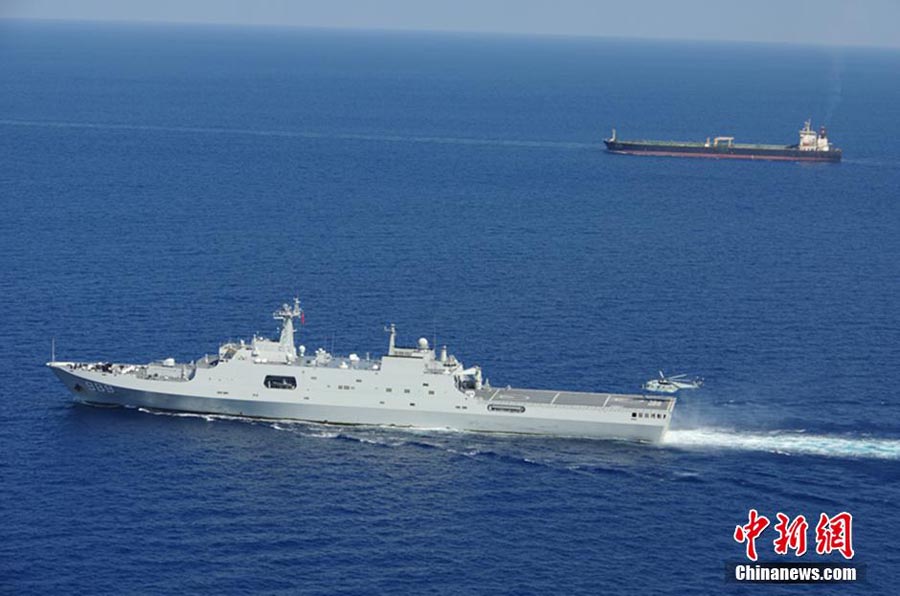 The Chinese naval escort fleet executing escort mission in the Gulf of Aden carries out ship-based helicopter flight training on Oct. 13, 2014. In view of the characteristics of the recent pirate activities, the fleet aims to improve the ability to deal with emergency situation through the training. (Chinanews.com/Xiao Yong)