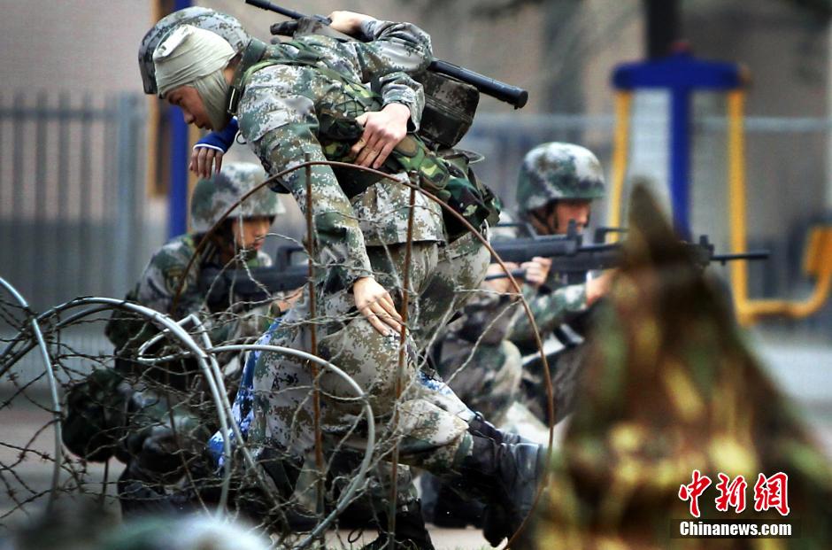 Norman Bethune Non-Commissioned Officer Medical School conducts adaptive medical exercise in Shijiazhuang, north China's Hebei province on Oct. 10, 2014. (CNS/Song Jihe)