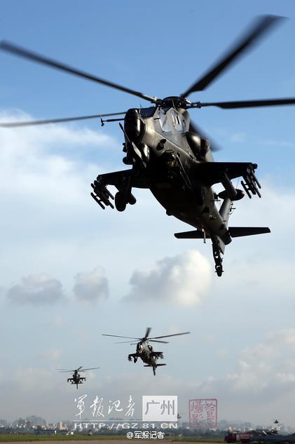 | An army aviation brigade of Guangzhou Military Region conducts a drill for the Z-10 attack helicopter formation on Oct. 13, 2014. (Photo source: Microblog of a PLA Daily reporter) |