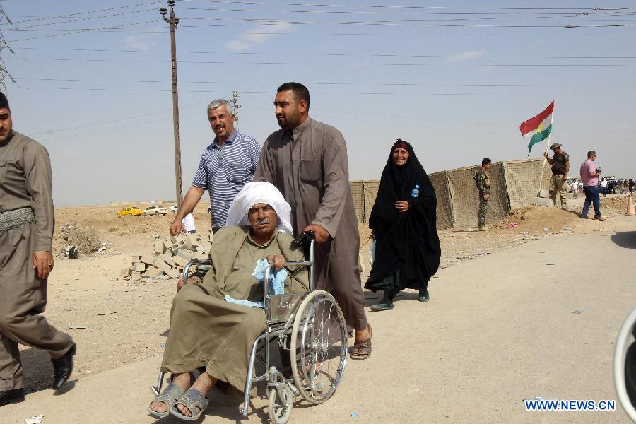 An elderly handicapped man pass the only crossing between Hawija and the city of Kirkuk, northern Iraq, on Oct. 15, 2014. Hawija is about 20km southwest of Kirkuk which is controlled by the Islamic state (IS). (Xinhua/Dena Assad)