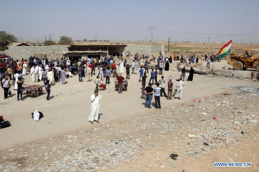 Groups of citizens gather at the only crossing between Hawija and the city of Kirkuk, northern Iraq, on Oct. 15, 2014. Hawija is about 20km southwest of Kirkuk which is controlled by the Islamic state (IS). (Xinhua/Dena Assad)