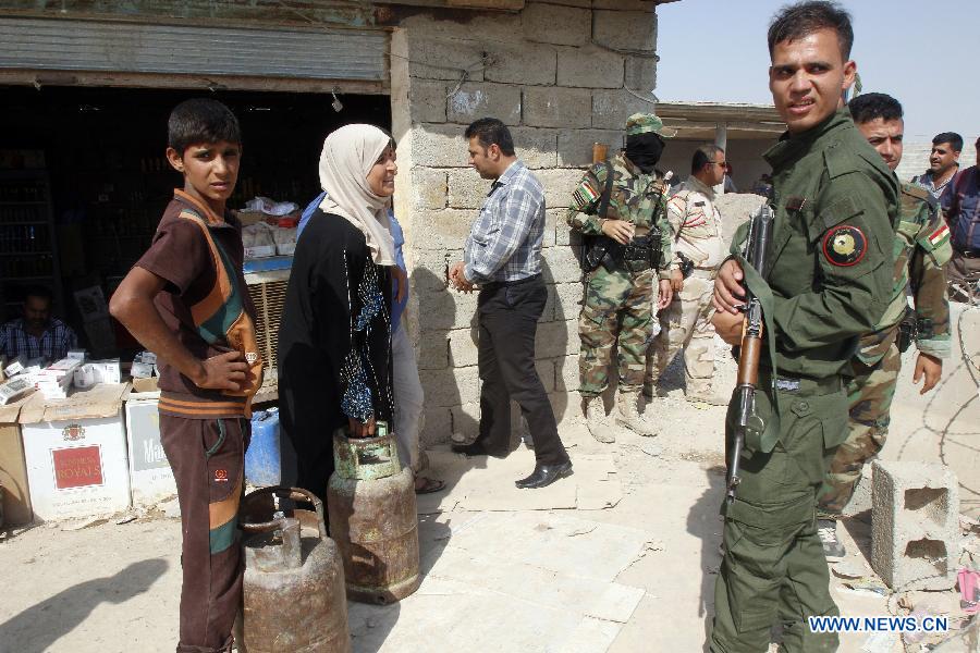 Woman tries to replace the gas bottle for cooking at the only crossing between Hawija and the city of Kirkuk, northern Iraq, on Oct. 15, 2014. Hawija is about 20km southwest of Kirkuk which is controlled by the Islamic state (IS). (Xinhua/Dena Assad)