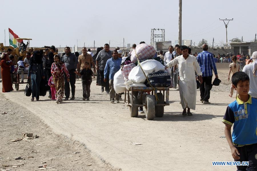 Citizens walk past the only crossing between Hawija and the city of Kirkuk, northern Iraq, on Oct. 15, 2014. Hawija is about 20km southwest of Kirkuk which is controlled by the Islamic state (IS). (Xinhua/Dena Assad)
