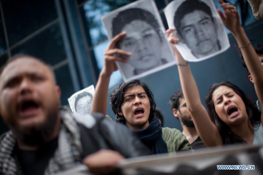 People take part in a protest for the 43 missing students of the Rural Normal School of Ayotzinapa in Guerrero, in front of the National Attorney General's Office in Mexico City, capital of Mexico, on Oct. 15, 2014. (Xinhua/Pedro Mera)
