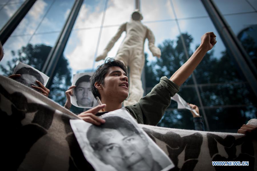 A man takes part in a protest for the 43 missing students of the Rural Normal School of Ayotzinapa in Guerrero, in front of the National Attorney General's Office in Mexico City, capital of Mexico, on Oct. 15, 2014. (Xinhua/Pedro Mera)