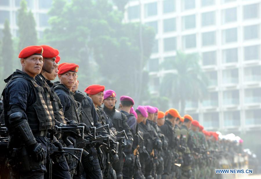 | Soldiers are deployed for the presidential inauguration in Jakarta, Indonesia, Oct. 16, 2014. Indonesian police and armed forces would jointly dispatch over 22,000 police and soldiers to boost the security during the inauguration ceremony of Indonesian President-elect Joko Widodo and his running mate Jusuf Kalla on Oct. 20, National Police Chief General Sutarman has said. (Xinhua/Agung Kuncahya B.) |