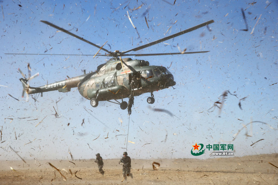 On Oct. 13, 2014, a joint campaign training is carried out by a mechanized infantry regiment and an aviation unit in Shenyang Military Region. Soldiers will enhance their capabilities of airborne operation in an environment close to the real combats, thereby integrally improving the troops' combat capability. (Photo/81.cn)