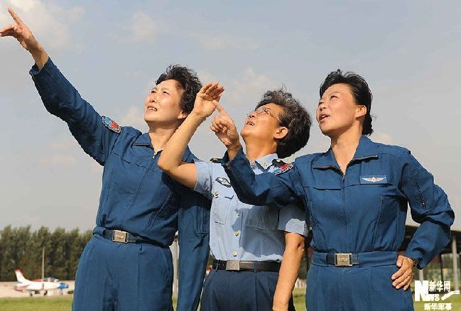 Yue Xicui, China's first female pilot general, the first female pilot commander Cheng Xiaojian, and deputy commander Liu Wenli, who conquered cancer and came back to the Parade Village to encourage the younger ones. (Xinhuanet/Photo)