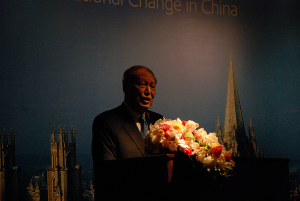 Cheng Siwei, Dean of the School of Management at the University of Chinese Academy of Sciences, delivers a keynote speech on Oxford China Business Forum 2014 on the afternoon of Oct. 14, 2014. (People's Daily Online/Yuan Can)