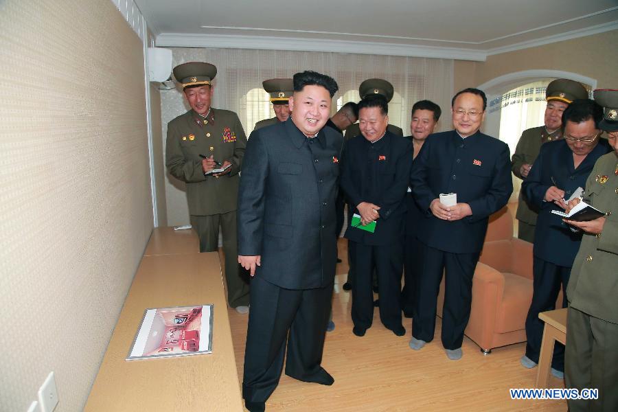 This undated photo provided by Korean Central News Agency (KCNA) shows top leader of the Democratic People's Republic of Korea (DPRK) Kim Jong Un (Front) giving field guidance to the completed apartment houses for educators of Kim Chaek University of Technology. (Xinhua/KCNA)