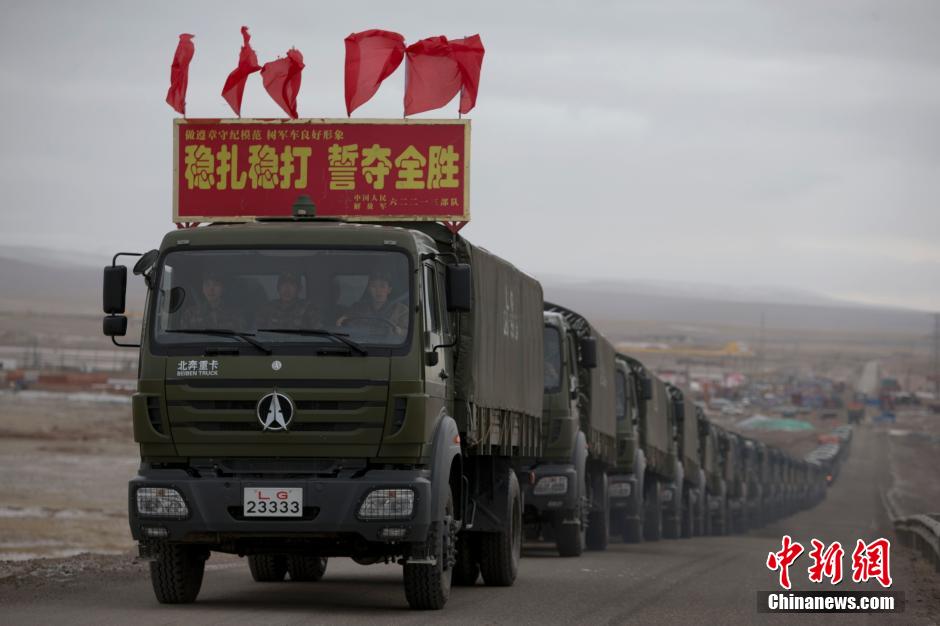 A regiment leaves from Tuotuohe army service station for Lhasa on Sept. 27, 2014. (Chinanews/Liu Guanguan)