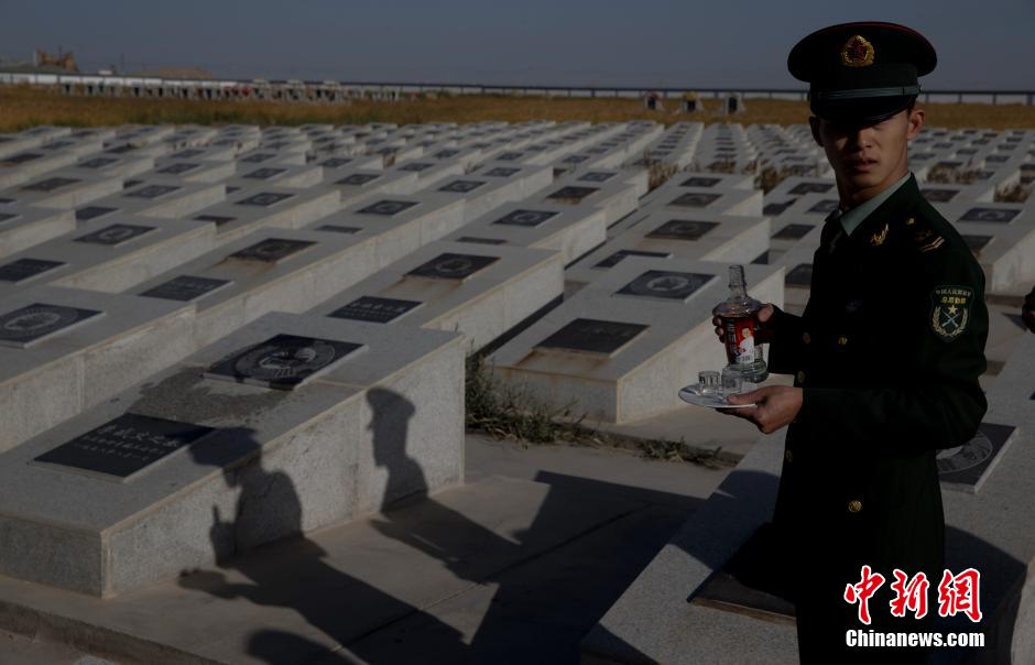 Soldiers pay respect to martyrs in the Golmud Martyrs' Cemetery on Sept. 23, 2014. Over 780 soldiers who sacrificed their lives when performing tasks on the plateau were buried here. (Chinanews/Liu Guanguan)