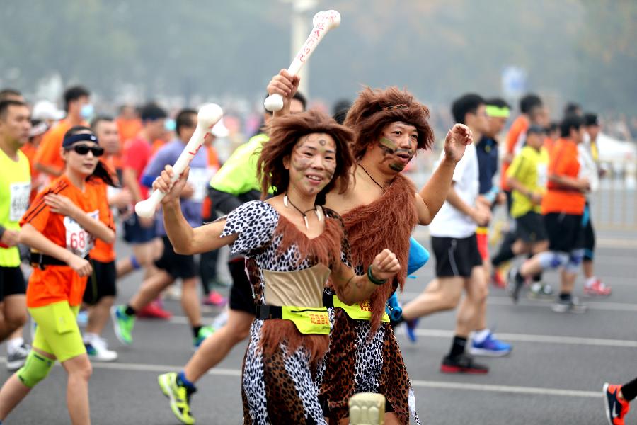 Two participants dressed as the figures in "the Croods" run in the 2014 Beijing International Marathon in the haze-surrounded Beijing, capital of China, Oct. 19, 2014. (Xinhua/Wang Zhen)
