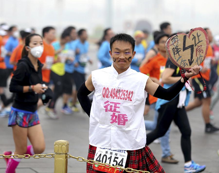 A participant seeks girlfriend in the 2014 Beijing International Marathon in the haze-surrounded Beijing, capital of China, Oct. 19, 2014. (Xinhua/Wang Zhen)