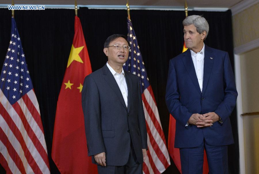 Chinese State Councillor Yang Jiechi (L) and U.S. Secretary of State John Kerry speak to reporters prior to a meeting in Boston, Massachusetts, the United States, Oct. 18, 2014. Chinese State Councillor Yang Jiechi said on Saturday that China is willing to work with the United States to make proper preparations for the upcoming visit to China by U.S. President Barack Obama so that it can yield positive results. (Xinhua/Yin Bogu)