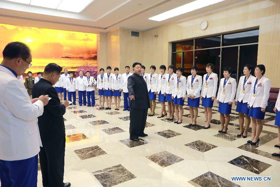 This photo provided by Korean Central News Agency (KCNA) on Oct. 19, 2014 shows top leader of the Democratic People's Republic of Korea (DPRK) Kim Jong Un meeting with gold medalists of the 17th Asian Games and recent world champions and their coaches in Pyongyang. (Xinhua/KCNA)