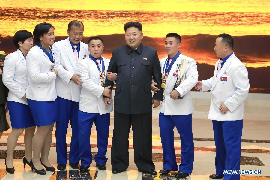 | This photo provided by Korean Central News Agency (KCNA) on Oct. 19, 2014 shows top leader of the Democratic People's Republic of Korea (DPRK) Kim Jong Un meeting with gold medalists of the 17th Asian Games and recent world champions and their coaches in Pyongyang. (Xinhua/KCNA) |