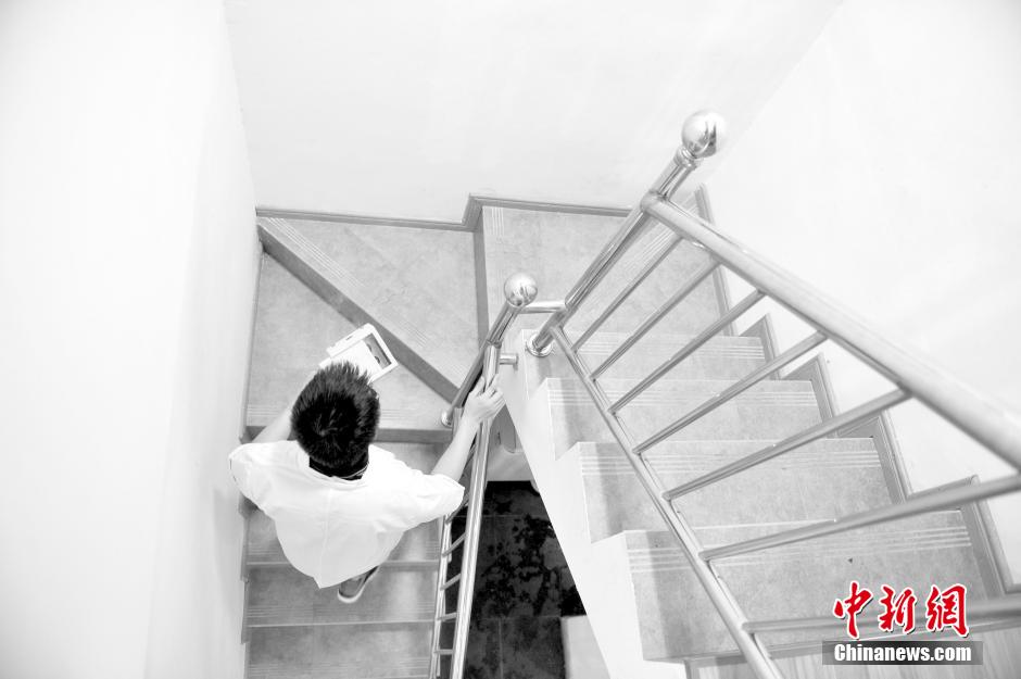 Xia Li walks upstairs holding tools for moxibustion. (CNS/Liu Zhankun)