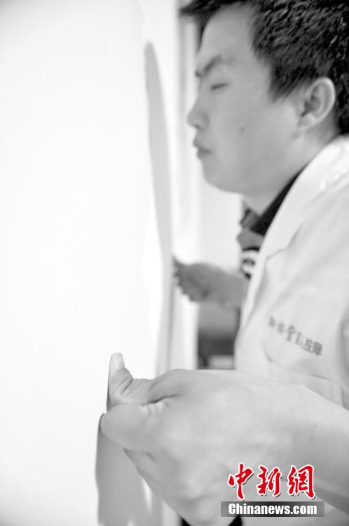 Compared with other fingers, Xia Li's thumbs are bend. Xia Li said that is caused by massage. "When I began to learn massage, in order to grasp proper power and skills, I had to do push-ups. My fingers swelled three times until I mastered basic skills. One should spare more efforts than others if he/she wants to learn massage," says Xia. (CNS/Liu Zhankun)