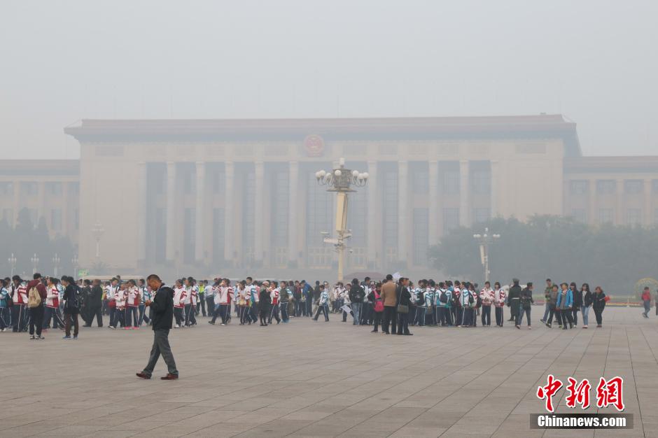 Visitors walk in the Tiananmen Square in the heavy smog. (Photo/CNS)
