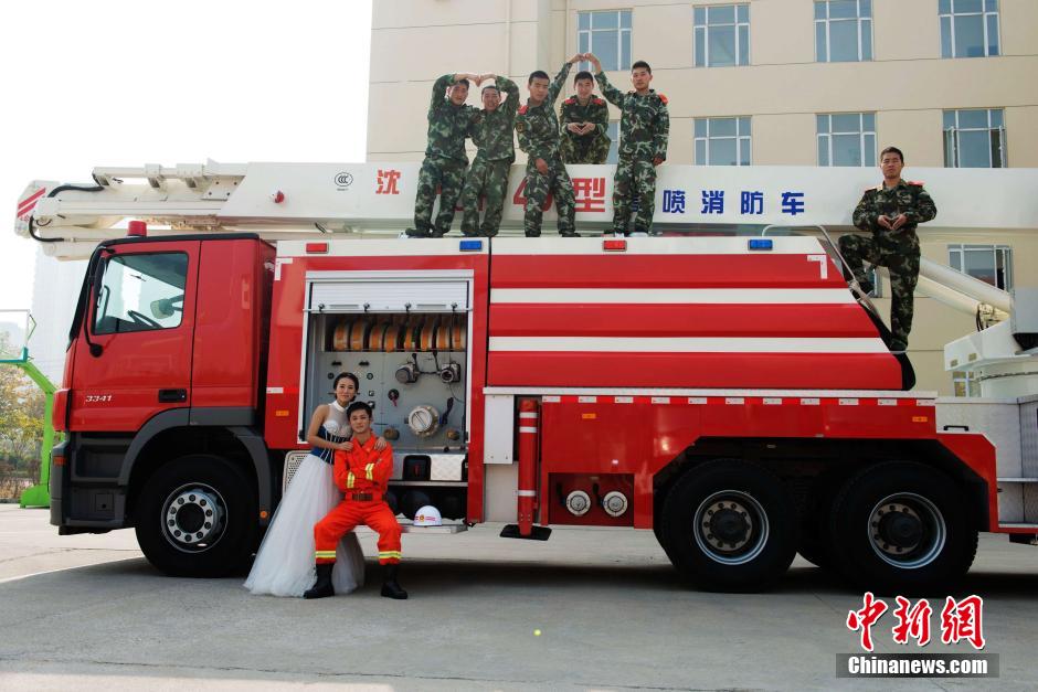 Wang Junwei, a firefighter in Huangdao District of Qingdao City, east China's Shandong Province, takes a group of wedding photos with his bride at his workplace, October 18, 2014. His colleagues, the fire trucks and the water hoses form a unique background for the photos. (CNSPHOTO/Jin Shaoyue)