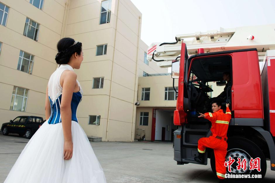 Wang Junwei, a firefighter in Huangdao District of Qingdao City, east China's Shandong Province, takes a group of wedding photos with his bride at his workplace, October 18, 2014. His colleagues, the fire trucks and the water hoses form a unique background for the photos. (CNSPHOTO/Jin Shaoyue)