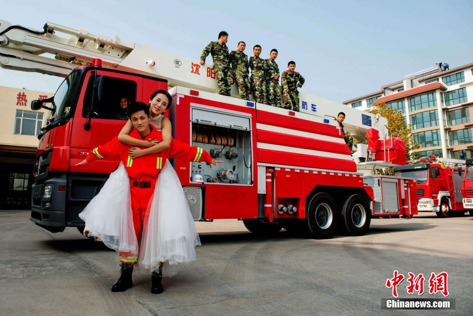 Wang Junwei, a firefighter in Huangdao District of Qingdao City, east China's Shandong Province, takes a group of wedding photos with his bride at his workplace, October 18, 2014. His colleagues, the fire trucks and the water hoses form a unique background for the photos. (CNSPHOTO/Jin Shaoyue)
