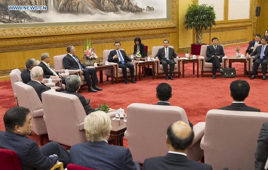 | Chinese Premier Li Keqiang meets with heads of delegations who are here to attend the APEC Finance Ministers Meeting at the Great Hall of the People in Beijing, capital of China, Oct. 21, 2014. (Xinhua/Huang Jingwen) |