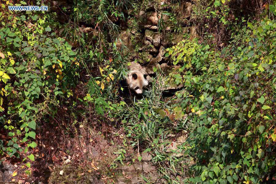 Photo taken on Oct. 19, 2014 shows a wild giant panda found at the Dajiangou scenic area in Huangbaiyuan Township in Taibai County of Baoji City, northwest China's Shaanxi Province. The wild panda appeared here on Sunday, according to a staff member of the local government. (Xinhua/Wang Li)