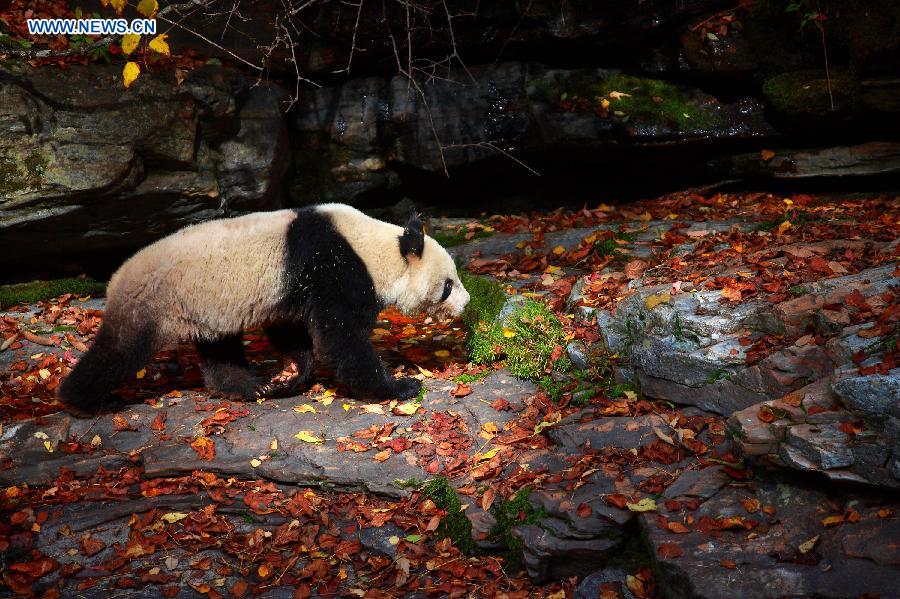 | Photo taken on Oct. 19, 2014 shows a wild giant panda found at the Dajiangou scenic area in Huangbaiyuan Township in Taibai County of Baoji City, northwest China's Shaanxi Province. The wild panda appeared here on Sunday, according to a staff member of the local government. (Xinhua/Wang Li) |