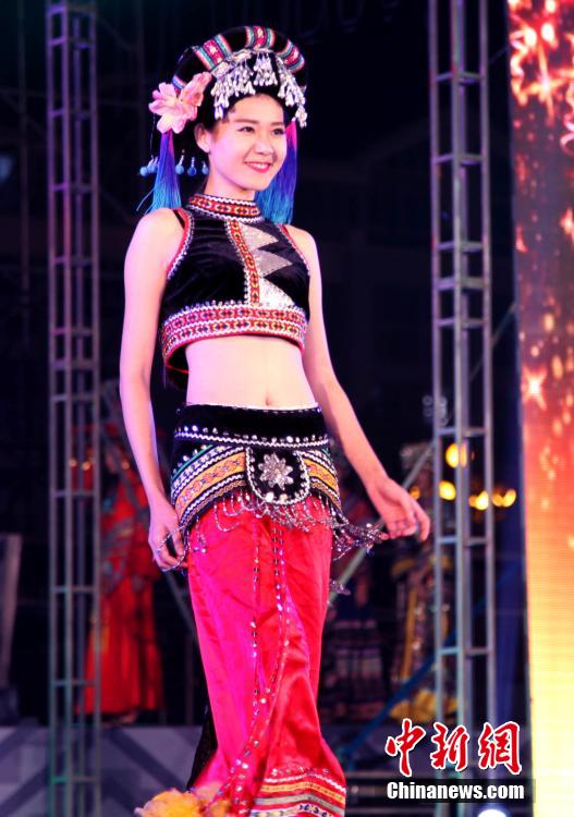 Photo taken shows a model in ethnic costume on the stage in Yizhou, S China’s Guangxi Zhuang Autonomous Rgion, on the evening of October, 19, 2014. (Photo by Yang Zhixiong)