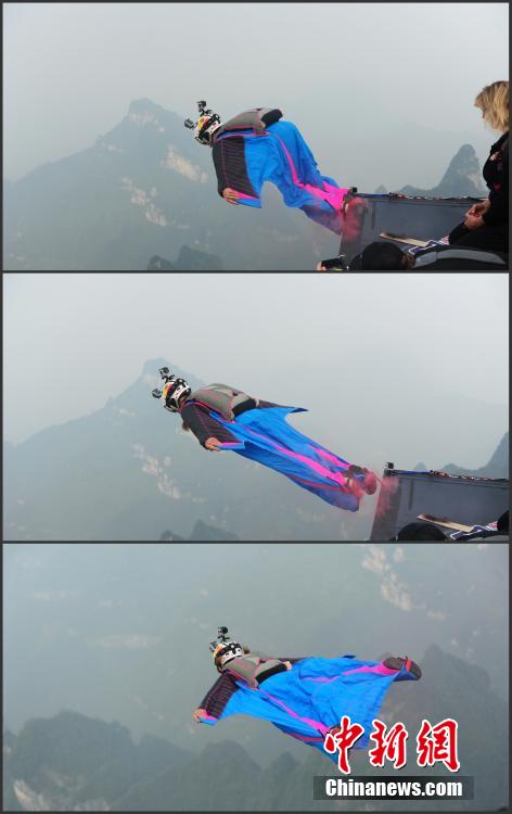 Competitor spreads the wings over Tianmen Mountain in Zhangjiajie, Hunan province, during the third World Wingsuit Championship, Oct. 19, 2014. (CNS/Yang Huafeng)