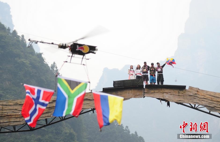 The 3rd World Wingsuit Championship was held in Zhangjiajie, central China's Hunan province on Oct. 19, 2014. South African Julian Boulle, won the championship with 33.25 seconds after completing an obstacle course on Tianmen Mountain, a tourist attraction in Zhangjiajie city.(CNS/Yang Huafeng)