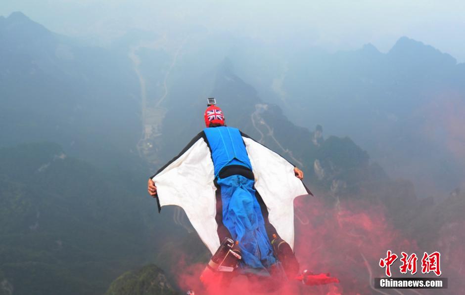 Competitor spreads the wings over Tianmen Mountain in Zhangjiajie, Hunan province, during the third World Wingsuit Championship, Oct. 19, 2014. (CNS/Yang Huafeng)