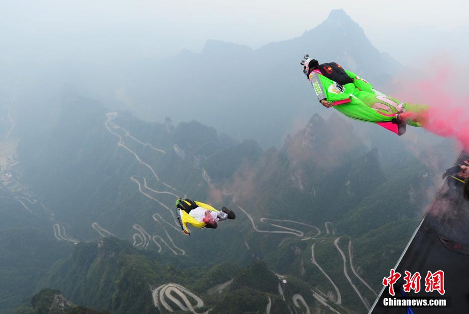 | Competitors spread their wings over Tianmen Mountain in Zhangjiajie, Hunan province, during the third World Wingsuit Championship, Oct. 19, 2014. (CNS/Yang Huafeng) |