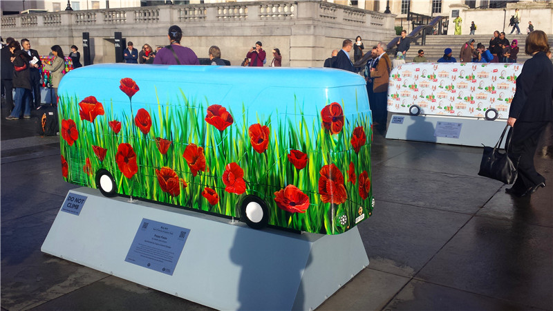 LONDON Oct. 21, People's Daily Online -- Twenty-eight New Routemaster bus sculptures were unveiled for the first time today in Trafalgar Square. These sculptures forms a collection of 60 bus sculptures, commissioned by Transport for London (TfL), which will be placed across London on four walking trails as part of the Year of the Bus Sculpture Trail. The first three trails will be installed for the public to enjoy from Monday 20 October with a fourth following for Christmas.