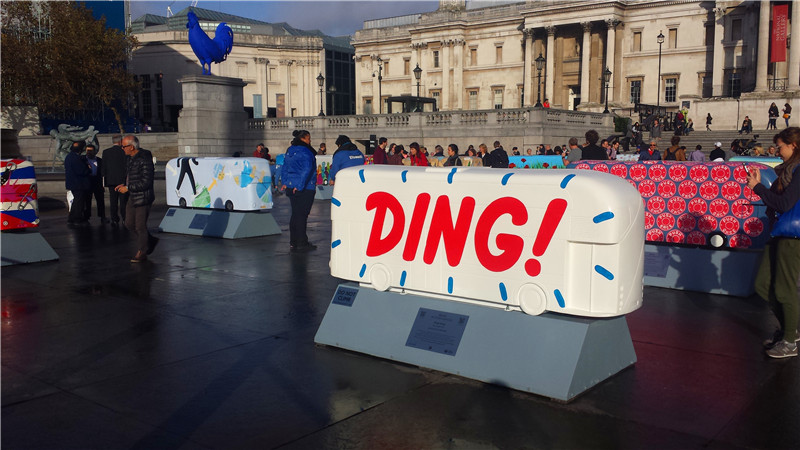 Routemaster bus sculptures is unveiled to mark the Year of the Bus. (People's Daily Online/Bai Tianixng)