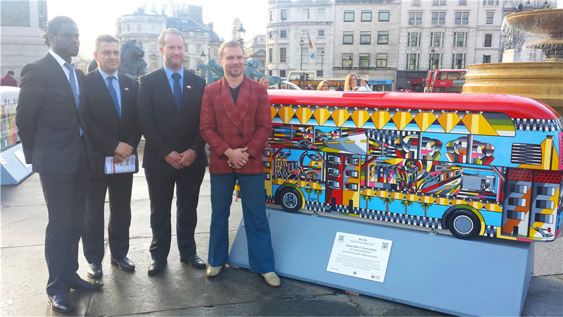 LONDON Oct. 21, People's Daily Online -- Twenty-eight New Routemaster bus sculptures were unveiled for the first time today in Trafalgar Square. These sculptures forms a collection of 60 bus sculptures, commissioned by Transport for London (TfL), which will be placed across London on four walking trails as part of the Year of the Bus Sculpture Trail. The first three trails will be installed for the public to enjoy from Monday 20 October with a fourth following for Christmas.