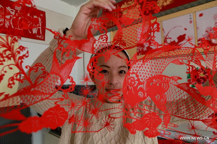 | A handicraftsman shows a paper cutting artwork in a studio in Jianping County, northeast China's Liaoning Province, Oct. 22, 2014. Paper cutting, the traditional Chinese folk art which uses red paper as material to make pictures by scissors, has been transfered from generation to generation in Jianping County and now has developed into a cultural industry. (Xinhua/Bai Tiejun) |